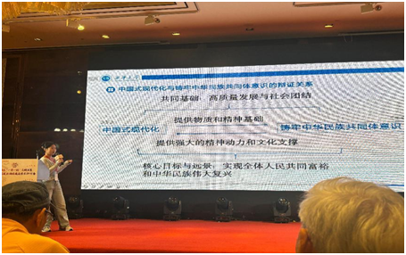 8日上午,专设研究生论坛。我院2023级研究生闫钰洁和尹可佳所撰写的论文《中国式现代化视域下铸牢中华民族共同体意识路径探析》受邀参会,闫钰洁做报告,聚焦铸牢中华民族共同体意识,坚持理论与实践相结合,在马克思主义理论指导下,从中国式现代化视角探寻铸牢中华民族共同体意识的路径。