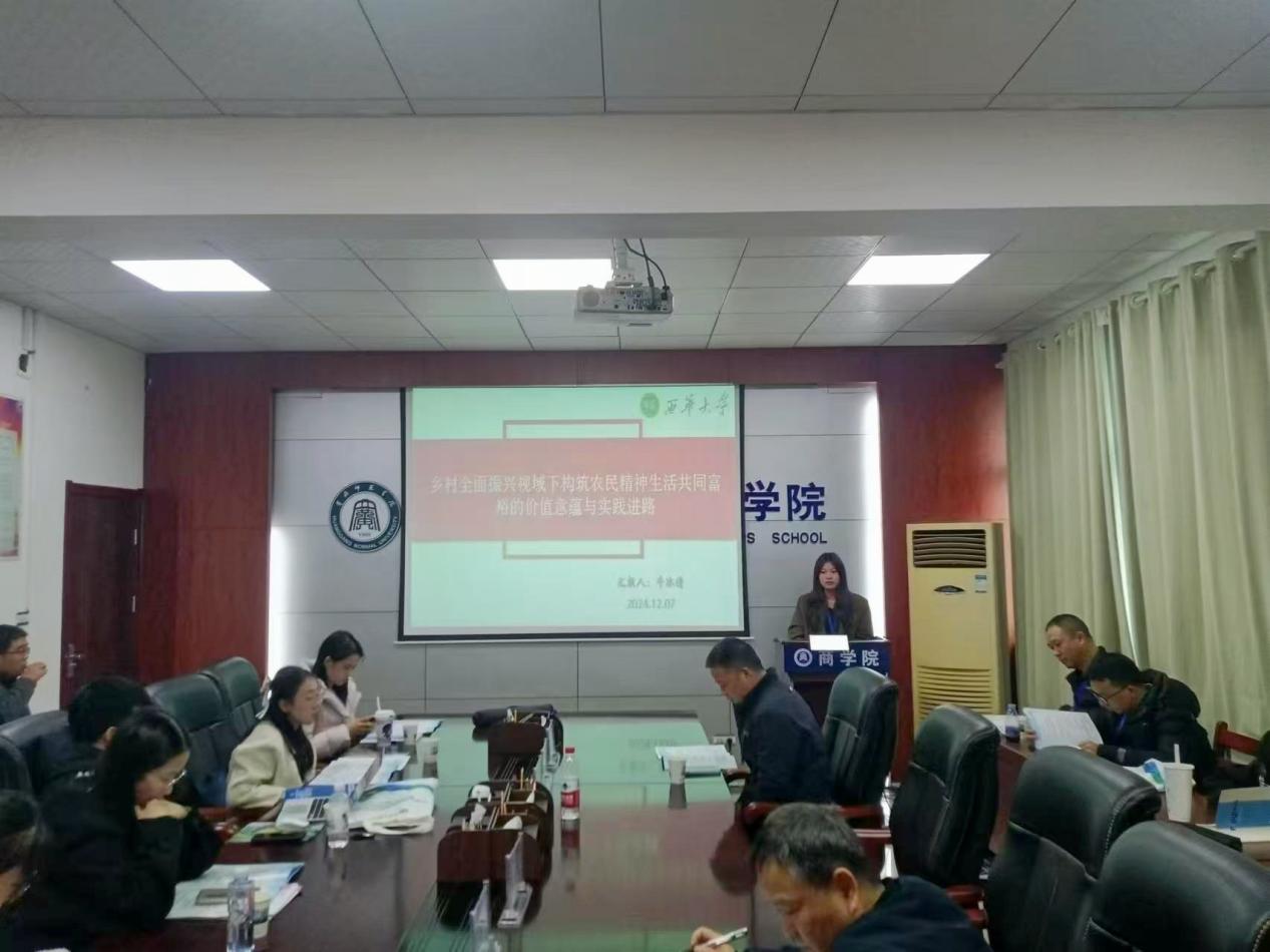 我院研究生牛冰倩所撰写的论文《乡村全面振兴视域下构筑农民精神生活共同富裕的价值意蕴与实践进路》受邀在第三分会坛上作报告。聚焦农民精神文化生活短板,进而通过多维度举措探寻构筑农民精神生活共同富裕路径,通过文化事业与产业“双轮驱动”、价值导向“核心引领”、组织与人才“双重保障”、农民主体“活力激发”,推动农民物质与精神生活“双平衡”“双富裕”,助力乡村全面振兴。