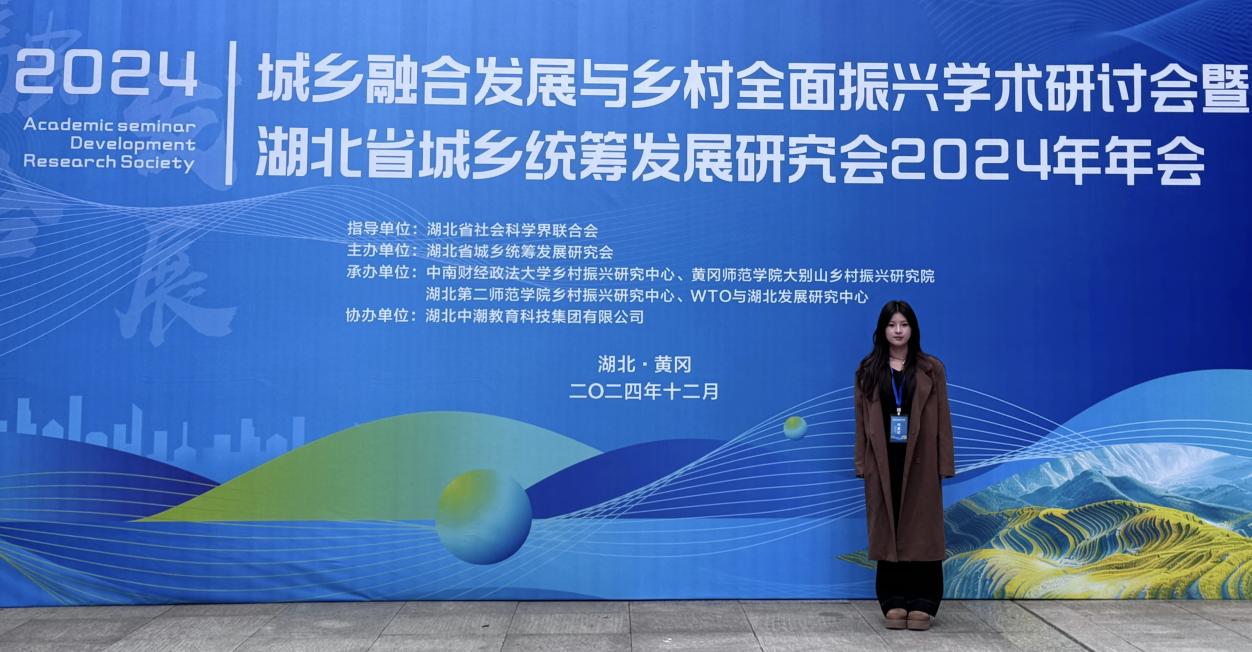 12月7日,城乡融合发展与乡村全面振兴学术研讨会暨湖北省城乡统筹发展研究会2024年年会在湖北黄冈举行。本次会议由湖北省城乡统筹发展研究会主办,由中南财经政法大学乡村振兴研究中心、黄冈师范学院大别山乡村振兴研究院、湖北第二师范学院乡村振兴研究中心联合承办。来自全国各地的100多名专家学者围绕“城乡融合发展与乡村全面振兴”这一主题共同研讨城乡融合发展的新路径、新模式,共同探寻乡村全面振兴的新策略、新举措。我院2023级马克思主义理论专业研究生牛冰倩应邀参会并在分论坛发言。