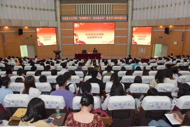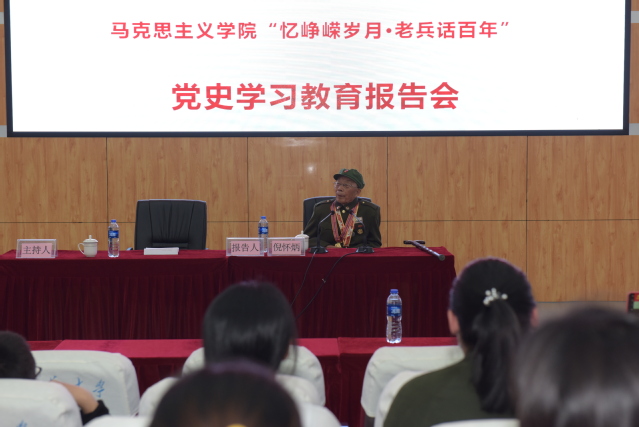 进一步推动党史学习教育,教育引导大学生深入学习党史知识,知党爱党、知史爱国,4月30日下午,马克思主义学院邀请抗美援朝的战斗英雄96岁的倪怀炳老人、郫都区退役军人公益志愿服务队宣传组副组长,曾服役上海警备区特警防爆团特警王鑫淼在学校四教报告厅作“忆峥嵘岁月•老兵话百年”党史学习教育报告,报告会由马克思主义学院党委副书记李欣主持。