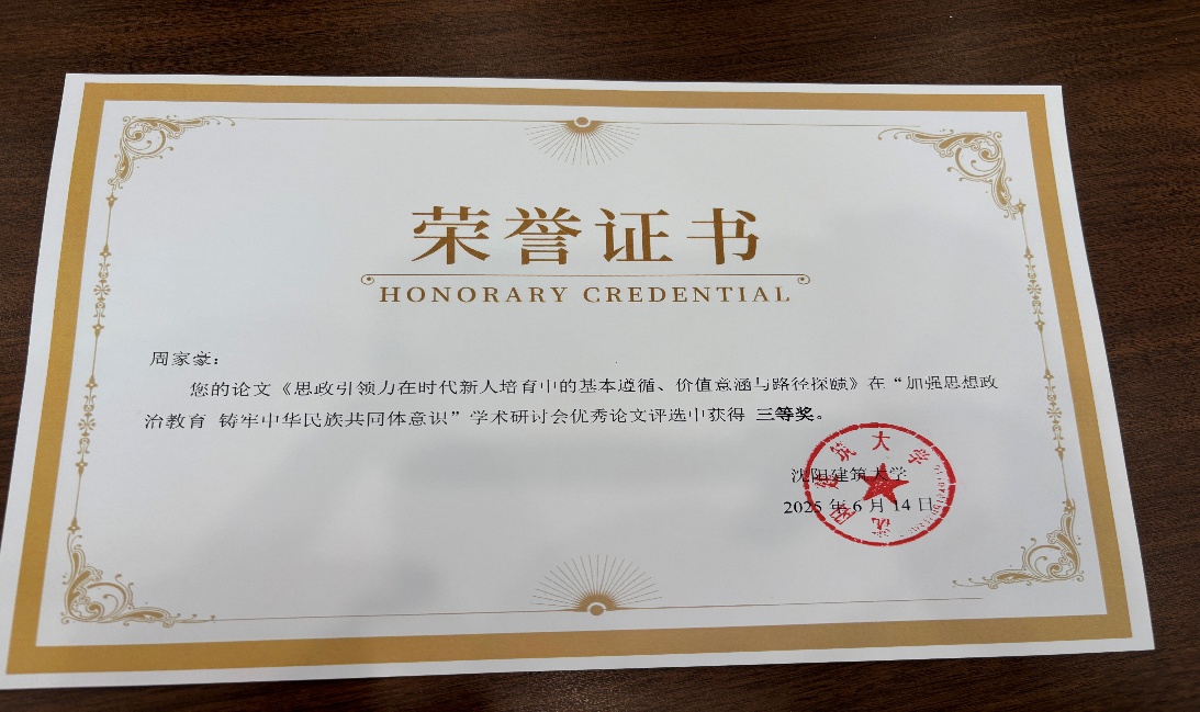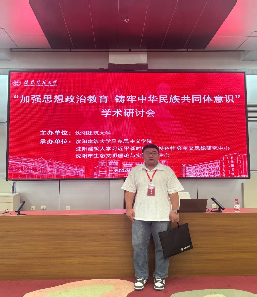 6月14日,由沈阳市生态文明理论与实践研究中心、沈阳建筑大学马克思主义学院及沈阳建筑大学习近平新时代中国特色社会主义思想研究中心联合举办的“加强思想政治教育 铸牢中华民族共同体意识”学术研讨会在辽宁沈阳召开。此次学术研讨会汇聚了来自北京大学、中国人民大学、厦门大学、深圳大学、吉林大学、哈尔滨工程大学、北京邮电大学、bw西汉姆联等全国共60余名专家学者、青年学者及硕博士研究生。我院2024级马克思主义理论专业研究生周家豪受邀参与此次会议。