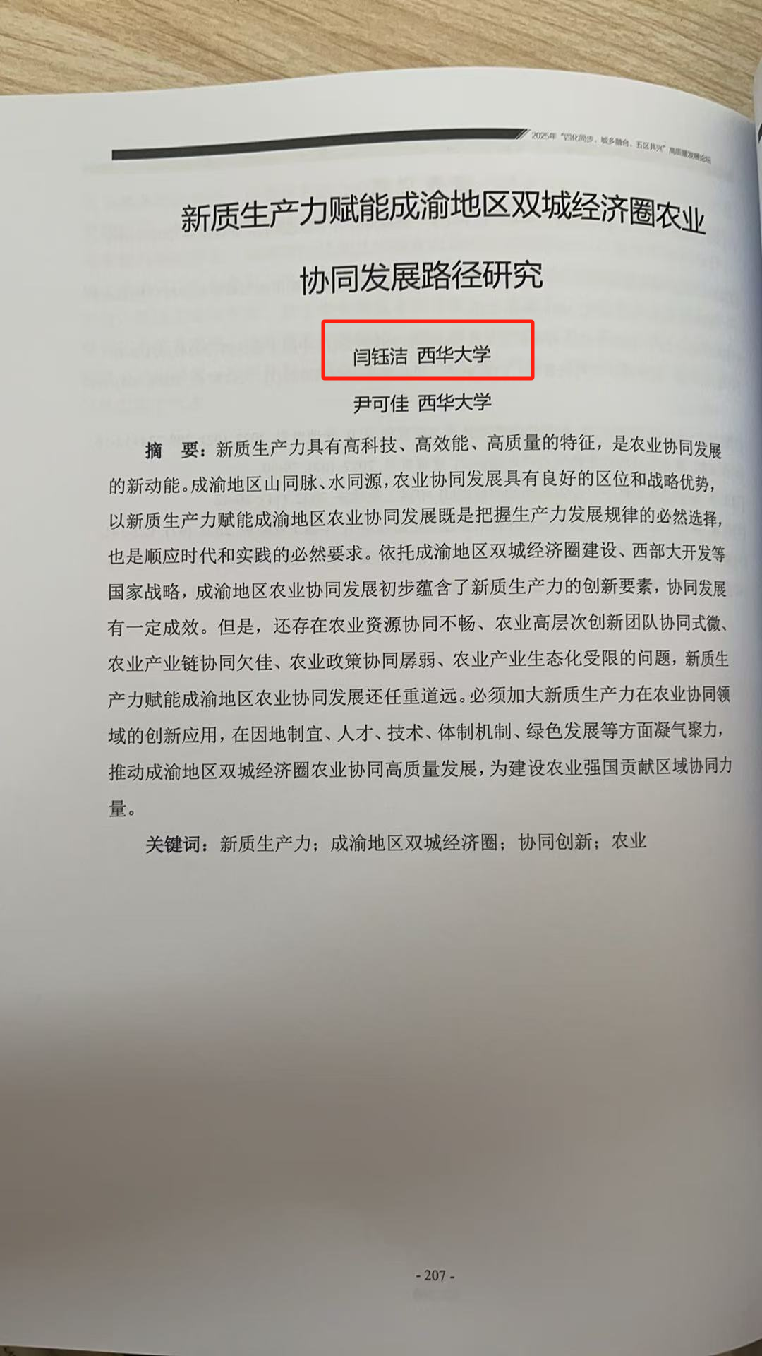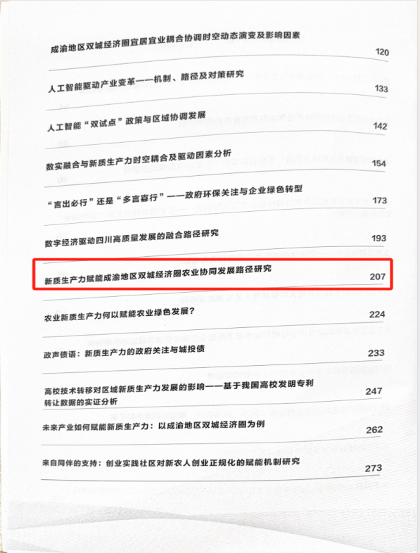 下午,论坛分设“城乡融合与乡村振兴”“区域协调与高质量发展”“人工智能与数字经济”“新质生产力与要素协同”四个分论坛,学者们各从不同视角对区域协调发展进行深刻剖析,开启了一场学术思想的盛宴。其中,我院2023级研究生闫钰洁和尹可佳所撰写的论文《新质生产力赋能成渝地区双城经济圈农业协同发展路径研究》受邀参会,并被收入论文集。