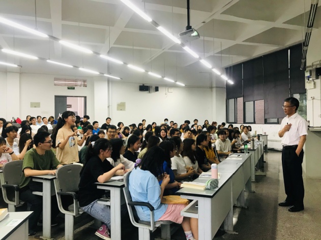 刘树根校长首先向同学们介绍了自己的所从事的专业领域,然后从中西方文化的差异、科技历史与现状作为切入点,围绕“我国科技自立自强必须且可能”、“深刻领会、准确把握中央决策部署”、“科技及其研究方法”、“我们怎么办?”等四个方面对“科技自立自强”进行了深入浅出的讲解。刘校长结合图片、视频和时事资料重点阐述了“我国科技自立自强必须且可能”,详细界定了“科学”、“技术”等概念,并结合实例讲解了科学的研究方法。刘校长的课堂有深度、有广度,更有温度。听课期间,同学们的笑声和掌声不断。课程尾声,刘校长与同学们展开交流与互动,并对同学们提到的图书馆环境、运动场地等问题一一做了解释和回答。