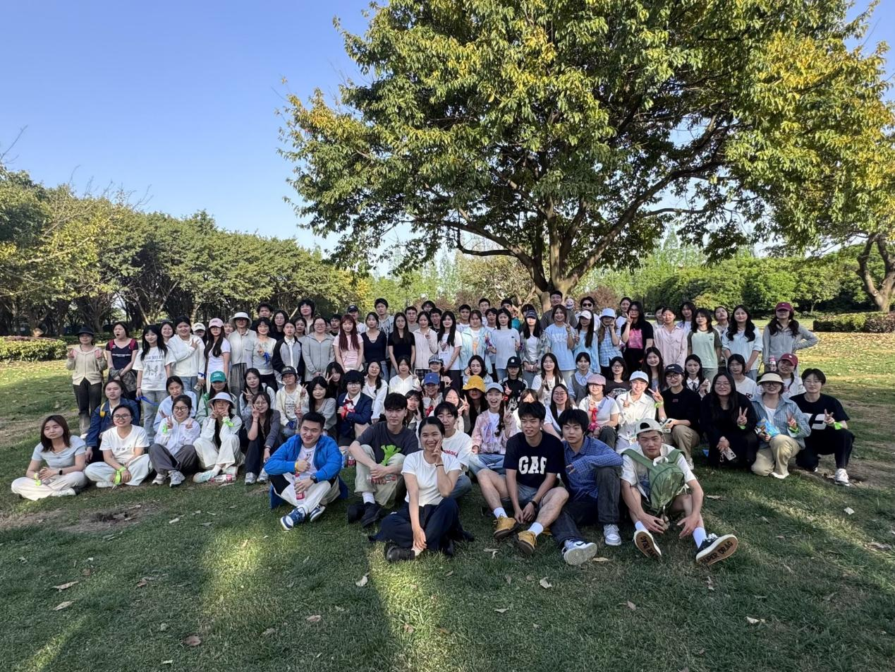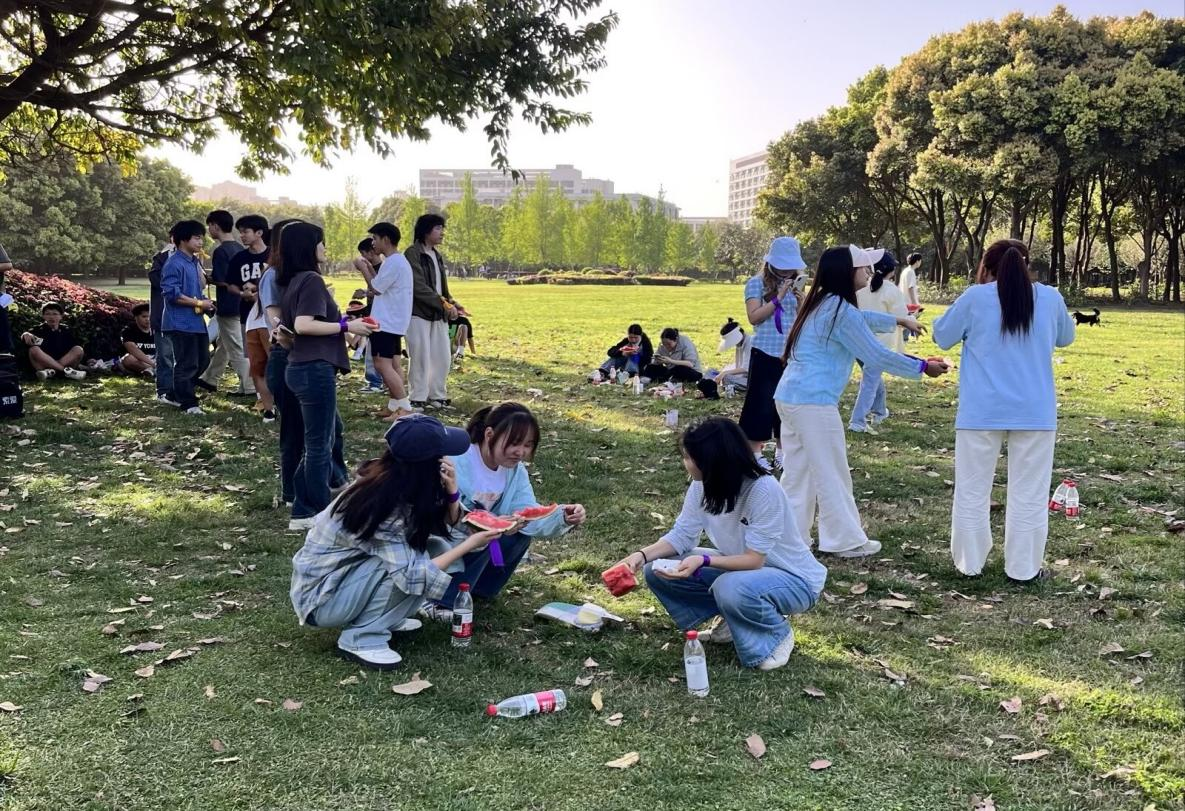 活动尾声,大家围坐在一起分享零食,薯片、果冻、水果摆满野餐垫。同学们一边品尝美食,一边畅谈活动感受,谈起来现在的温馨和熟络,话语间满是对班级的归属感。最后,全体同学在镜头前摆出创意造型,一张张笑脸定格在春日里,一张圆满的团建大合照,为本次的快乐团建画上句号。