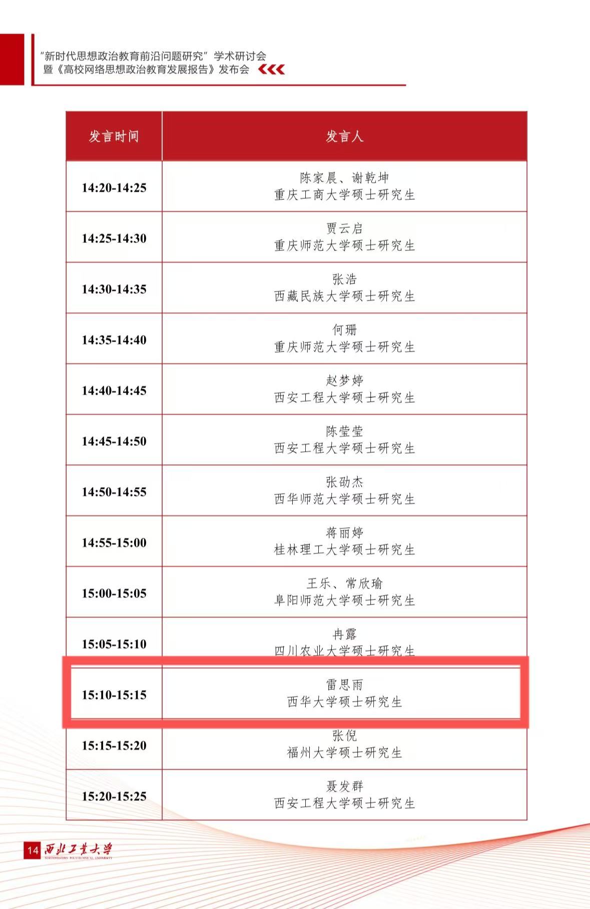 2025年11月29日,由教育部高校思想政治教育工作创新发展中心(西北工业大学)、西北工业大学马克思主义学院举办的“新时代思想政治教育前沿问题研究”学术研讨会暨《高校网络思想政治教育发展报告》发布会,在陕西省西安市西北工业大学顺利召开。来自中央财经大学、电子科技大学、西北工业大学、陕西科技大学、北京航空航天大学、武汉大学等高校的百余位国内知名专家学者、青年学者及优秀硕博研究生参加会议。我院2024级马克思主义理论专业硕士研究生雷思雨受邀参加此次会议。