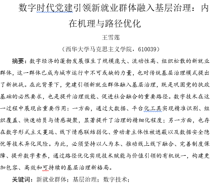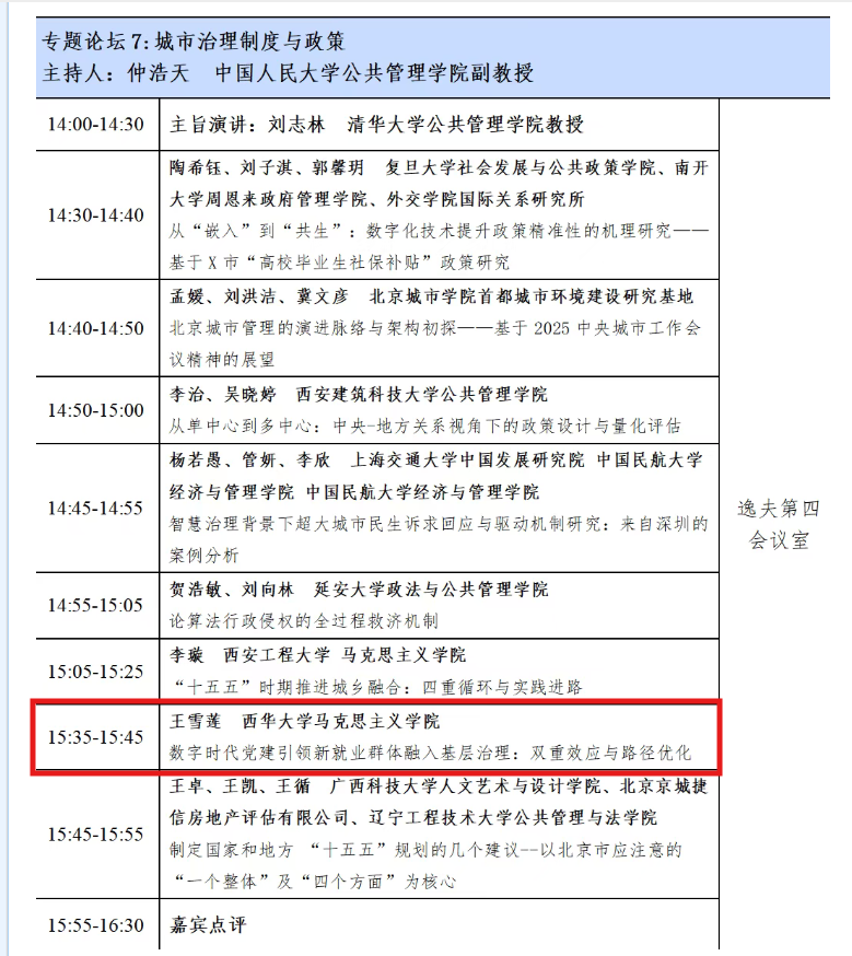 下午分为圆桌论坛、专题论坛、博士生论坛,围绕“城乡公共治理学科建设”“创新城市与新质生产力”“以人民为中心的宜居城市”“城市更新理论与治理创新”“智慧城市理论与实践探索”“社区与基层治理”等展开专题研讨。我院2024级研究生王雪莲撰写《数字时代党建引领新就业群体融入基层治理:内在机理与路径优化》一文,并在专题论坛7:城市治理制度与政策进行交流发言。