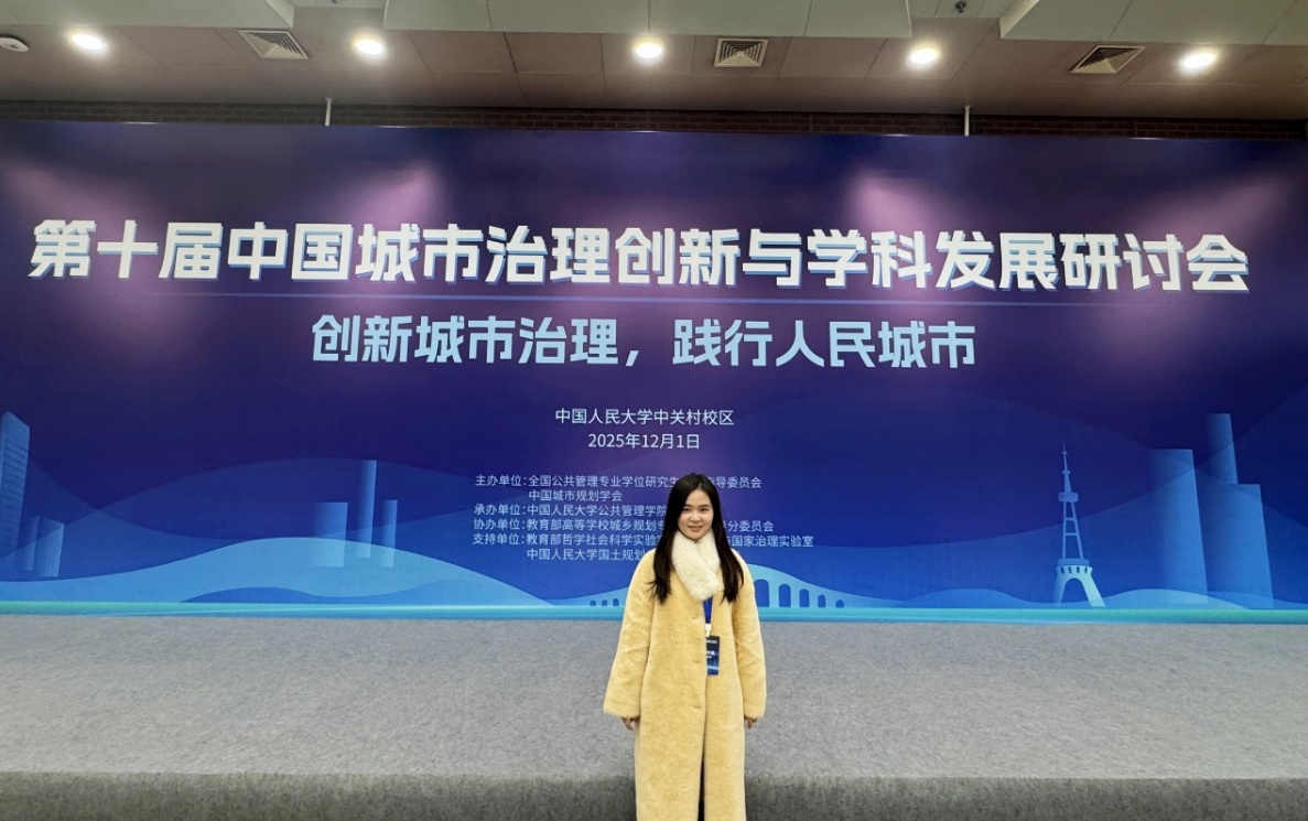 为深入学习贯彻落实中央城市工作会议精神,在新的历史方位下系统推进城市治理学术研究与学科发展,推动专家学者围绕落实“五个转变”与“五个更加”的城市治理议题展开深度交流,2025年12月1日,由全国公共管理专业学位研究生教育指导委员会、中国城市规划学会主办,中国人民大学公共管理学院承办的“第十届中国城市治理创新与学科发展研讨会”在北京成功举行。我院2024级马克思主义理论专业研究生王雪莲受邀参加此次研讨会。