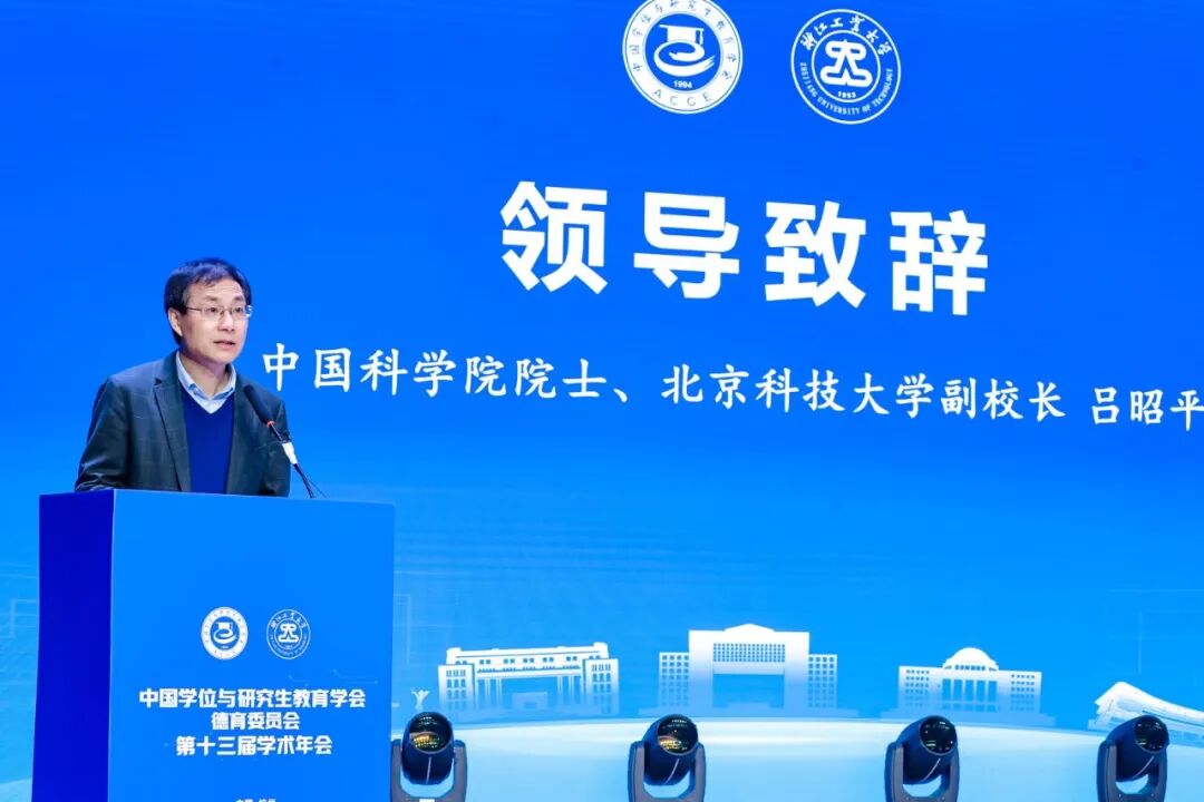 在会议致辞阶段。中国学位与研究生教育学会副会长陈子辰指出,要深刻认识研究生教育在强国建设中的历史使命,统筹推进教育、科技、人才一体化发展,构建研究生育人新业态。中国科学院院士、北京科技大学副校长吕昭平代表秘书处单位表示,学会将坚持立德树人,继续搭建多维平台,优化运行机制,助力研究生教育事业发展。浙江工业大学党委副书记吴巨慧介绍了浙工大构建“德育、学术、发展、文化”四个共同体的研究生思政体系,以及推动思政教育与专业科研深度融合的经验。