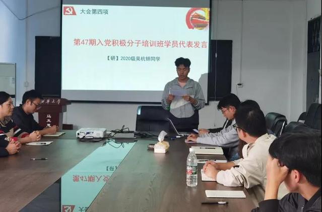 接下来,学员代表研2020级吴杭锌同学发言。他说到要向党组织表明自己的决心,端正入党动机,思想上、作风上、行动上接受党的培训,做到学以正心,学以养德,学以修为,学以增智。以最饱满的热情,最全面的投入,最实际的行动来完成党校培训。随后,本2019级袁澳同学带领第47期入党积极分子培训班全体学员做集体承诺,并签写承诺书。