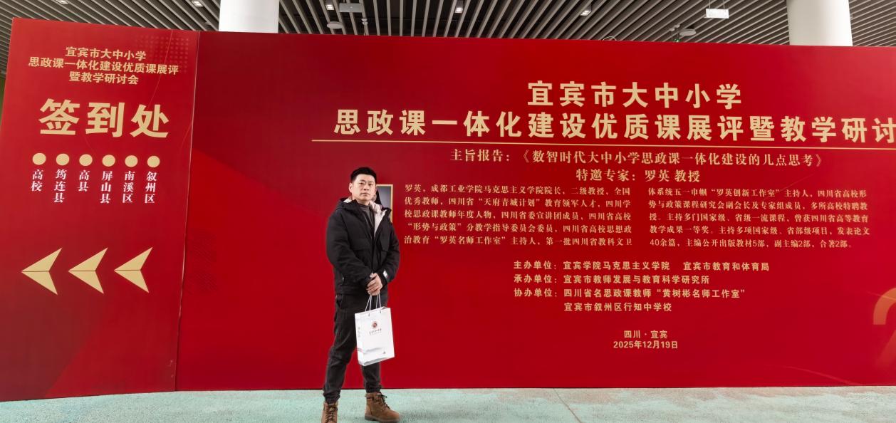 2025年12月19日,宜宾市大中小学思政课一体化建设优质课展评暨教学研讨会在宜宾市叙州区行知中学校隆重举行。本次活动由宜宾学院马克思主义学院与宜宾市教育和体育局主办,宜宾市教师发展与教育科学研究所承办,由四川省名思政课教师“黄树彬名师工作室”和宜宾市叙州区行知中学校协办,旨在探索思政课一体化建设新路径。我院教师何为、张洪、范霞受邀参加教学研讨会。
