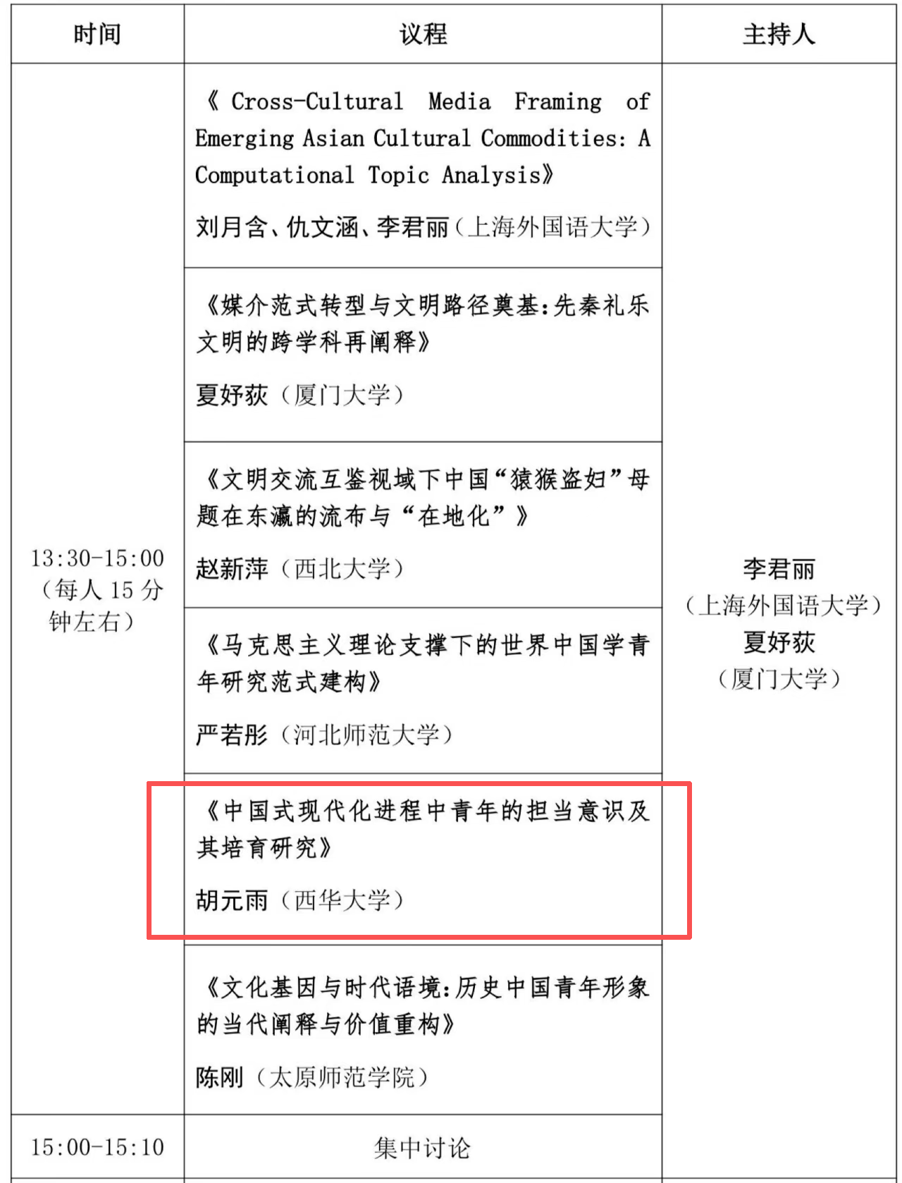 下午分为青年圆桌对话+分论坛研讨,围绕“历史中国与当代中国的青年阐释”“数字人文与世界中国学研究”“跨学科视角下的世界中国学相关问题解析”“文明互鉴视野中的世界中国学研究”“世界中国学学术共同体的青年建构”“历史中国与当代中国的贯通路径”等展开专题研讨。我院2024级研究生胡元雨撰写《中国式现代化进程中青年的担当意识及其培育研究》一文,并在专题论坛5:历史中国与当代中国的青年阐释进行交流发言。