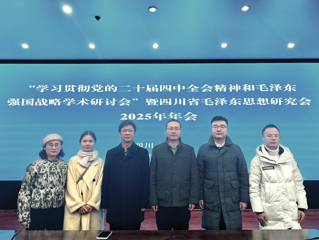 2025年12月28日,“学习贯彻党的二十届四中全会精神和毛泽东强国战略学术研讨会”暨四川省毛泽东思想研究会2025年年会在四川省社会科学院顺利举办,年会由四川省毛泽东思想研究会主办,四川省社会科学院马克思主义学院、《毛泽东思想研究》杂志社承办。汇聚了省内外高校、党校、科研院所等相关领域的百余名专家学者,围绕深入学习贯彻党的二十届四中全会精神,深化对习近平新时代中国特色社会主义思想的研究、宣传与阐释,推进毛泽东思想及其当代价值的研究等内容展开研讨。我院党委书记冯永泰、《毛泽东思想和中国特色社会主义理论体系概论》教研室主任李扬扬、研究生教学部系主任曾小林,教师周雨童、彭娜、刘恒宇受邀参加。