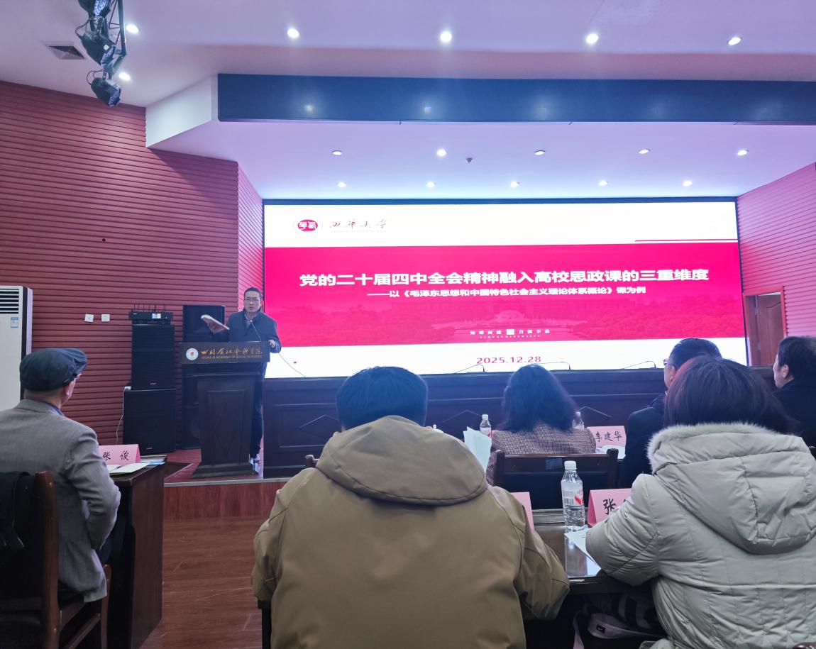 第二阶段议程为学术研讨,由四川省社会科学院马克思主义学院副院长赵小波主持。四川省社会科学院院长杨颖围绕“毛泽东社会主义现代化战略思想”行主题发言。中共四川省委党校党建教研部的梁晓宇、四川大学马克思主义学院院长李建华、西南交通大学马克思主义学院副院长谢瑜、西南财经大学马克思主义学院胡建教授、西南石油大学马克思主义学院党委书记林莉、西南民族大学马克思主义学院副院长高乃云、成都医学院马克思主义学院院长张俊、四川旅游学院马克思主义学院党委副书记李秀铎、乐山学院马克思主义学院副院长赖伟等分别围绕相关主题作了学术分享。我院《毛泽东思想和中国特色社会主义理论体系概论》教研室主任李扬扬以“党的二十届四中全会精神融入高校思政课的三重维度——以《毛泽东思想和中国特色社会主义理论体系概论》课为例”为题,进行了主题发言。