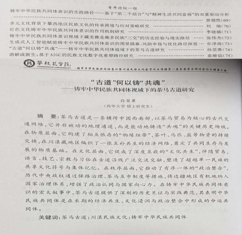 下午为平行分论坛研讨会。会议共设置7个分论坛,包括5个学者论坛和2个青年论坛。与会代表围绕川滇民族文化数字化路径、非遗保护与文旅融合、中华民族共同体意识培育、红色文化与民族交融等议题展开深入研讨。我院2024级研究生孙笛箫撰写的论文《“古道”何以铸“共魂”——铸牢中华民族共同体视域下的茶马古道研究》在第一组青年论坛进行发言,论文以“物质—文化—秩序”为三维分析框架,分别对应“物缘纽带”“文化共生”“政治整合”,层层递进,系统阐释茶马古道在促进民族交往、交流、交融中的作用机制,深刻揭示了其在铸牢中华民族共同体意识过程中的历史基础与实践路径。