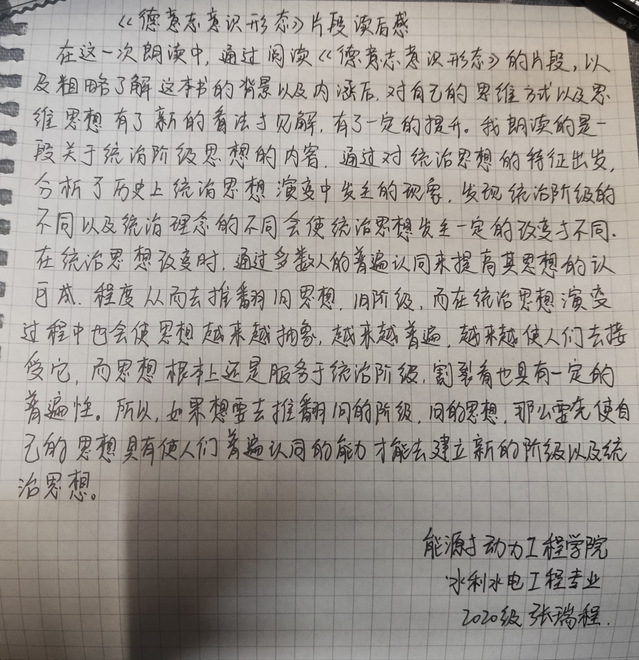 能源与动力工程学院 水利水电工程 2020级 张瑞程