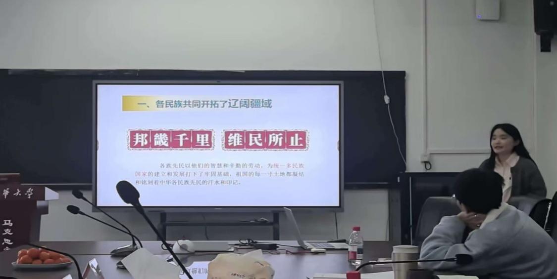 教学展示环节,胡海利、丁洁莹两位新进青年教师进行了教学展示。胡海利选择《习近平新时代中国特色社会主义思想概论》“坚持以人民为中心”专题,以凉山慢火车、苏区送盐、小岗村改革等鲜活案例为切入点,从“为了谁、依靠谁、谁评判”三个维度阐释人民至上的内涵和要求。丁洁莹选择“筑牢中华民族共同体意识”教学专题,聚焦“五个共同”的内涵,结合贵春民族文化展示、成都唐卡馆实践等案例,梳理各民族共同开拓疆域、缔造国家、书写历史、创造文化、培育精神的发展脉络,引导学生树立正确的民族观。两位教师的展示,教学设计层层递进、案例贴合实际,充分展现了青年教师扎实的理论功底和认真的教学态度。