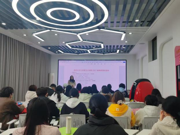 会上,钟兴悦首先分析了近年来考研竞争加剧的现实背景,强调了在考研“内卷化”的当下,科学择校对于提升“上岸率”的关键作用。她引导同学们将个人理想与国家发展、社会需求相结合,明确考研动机,避免盲目跟风,树立理性的考研观。