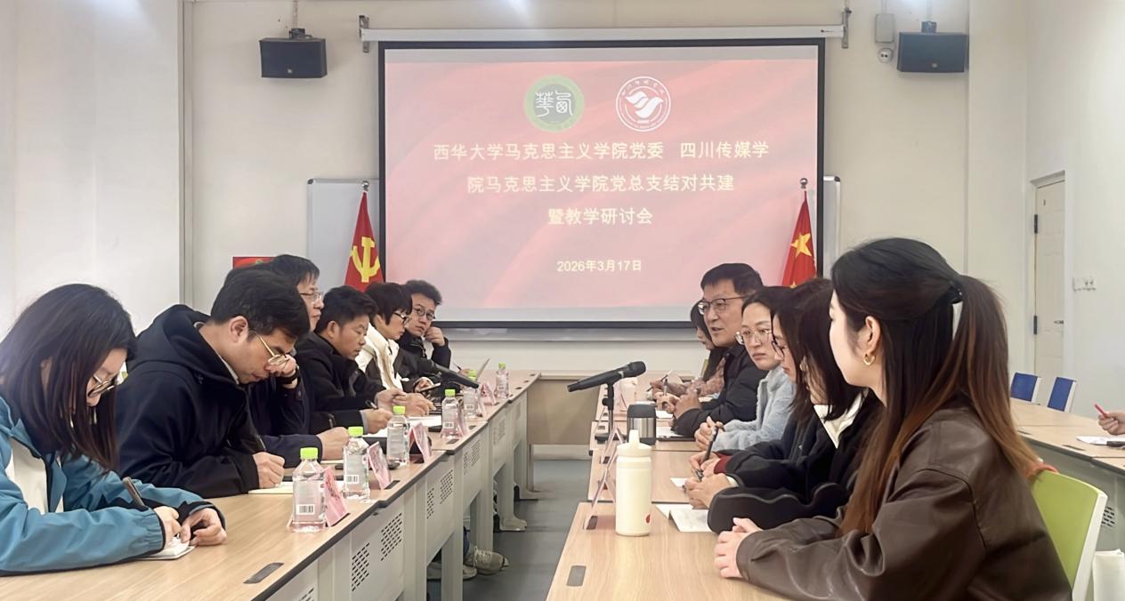 为深入贯彻习近平总书记关于思想政治理论课建设的重要论述,全面落实中共四川省委教育工委、中共四川省委组织部、四川省教育厅相关通知精神要求,进一步深化推进结对共建工作,2026年3月17日下午,bw西汉姆联马克思主义学院与四川传媒学院马克思主义学院结对共建暨教学研讨会在四川传媒学院东区A1-218室举行。bw西汉姆联马克思主义学院党委书记冯永泰、党委副书记钟灵波、副院长尹德志、副院长王京强与思政本科教学部支部书记和主任,四川传媒学院马克思主义学院党总支书记、院长赵万江、副院长刘光玲及各教研室主任出席会议。