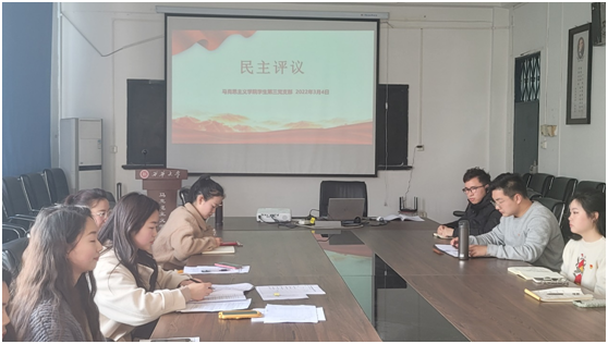 为推进党史学习教育,深入学习贯彻党的十九届六中全会精神,不断推进党的建设新的伟大工程,根据《中国共产党组织工作条例》规定以及校党委《关于召开2021年度专题组织生活会和开展民主评议党员工作的通知》的精神,3月4日下午,马克思主义学院学生第三党支部在一教5015办公室召开2021年度组织生活会和开展民主评议党员活动,会议由党支部书记米娜同志主持,支部全体党员同志参会。