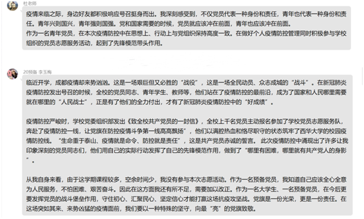支部党员就身边党员的先进事迹在支部群内作了分享。马克思主义学院学生第四党支部支部书记杜靖说到,通过此次学习,他深刻感受到,不仅党员代表一种身份和责任,青年也代表一种身份和责任。青年兴则国兴,青年强则国强。在党和国家需要的时候,党员就应该冲在前面,青年也应如此。