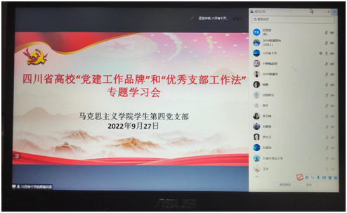 2022年9月27日晚18:00,马克思主义学院学生第四党支部于腾讯会议组织开展了《四川省高校“党建工作品牌”》和《四川省高校“优秀支部工作法”》线上学习。党支部书记杜靖及支部全体党员参与会议。会议由杜靖主持。