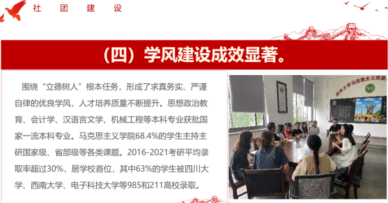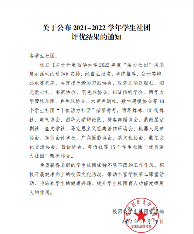 2022年11月7日下午16点,2021-2022学年优秀学生社团评选答辩在学生活动中心4楼拉开帷幕。答辩现场众多社团齐展风采。马克思主义经典著作研读会围绕“社团简介”“特色活动”“社团建设成效”三个方面向现场评委老师和其他社团负责人介绍了研会一年来的各项活动开展情况和日常运行。其中,“特色活动”和“社团建设成效”内容生动活泼,获得在场人员的一致好评。最终,本研究会荣获学生社团“优秀活力社团”荣誉称号。