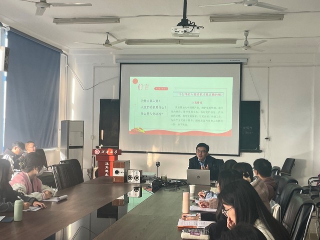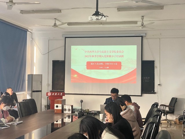 2022年11⽉22⽇上午9点,马克思主义学院⼊党积极分⼦培训班于⼀教5015会议室开展了第⼆次课堂教学活动,马克思主义学院党委副书记、纪委书记⽯元鹏为⼤家讲授了主题为《端正⼊党动机,争取早⽇⼊党》的党课。