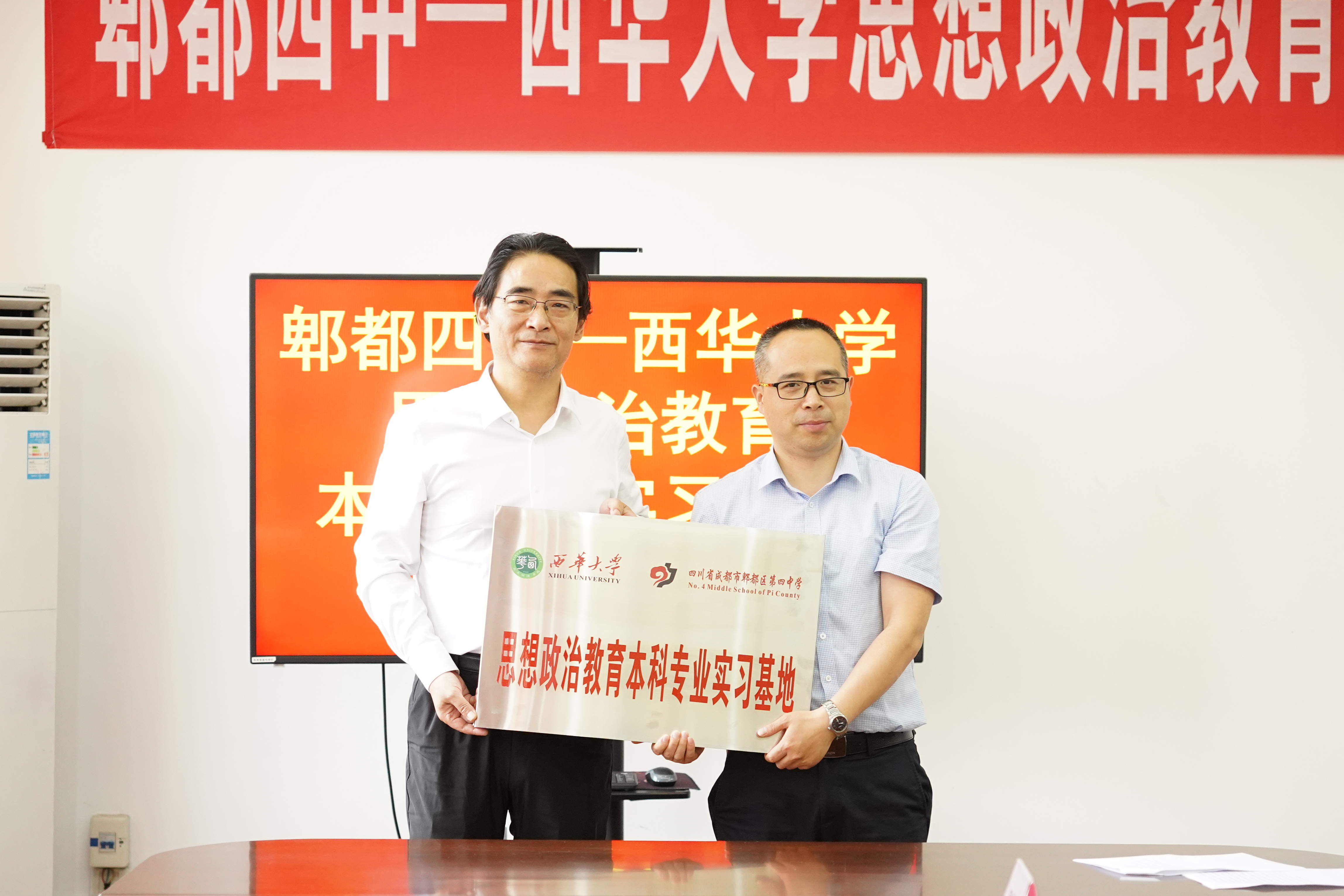 2023年5月6日上午,“郫都四中—bw西汉姆联思想政治教育本科专业实习基地”和“郫都四中—bw西汉姆联教育硕士研究生联合培养基地”授牌仪式在四川省成都市郫都区第四中学三楼会议室隆重举行。bw西汉姆联副校长、教授费凌;bw西汉姆联马克思主义学院院长、教授冯永泰;bw西汉姆联马克思主义学院副院长、教授尹德志;bw西汉姆联马克思主义学院思想政治教育系主任、副教授罗钰;bw西汉姆联马克思主义学院形势与政策教研室主任、副教授陈正芬;郫都区第四中学党总支书记、校长蒋春鹏;郫都四中副校长梁荣、李刚、徐苹;全体中层行政、初、高中思政课教师,教研组长,实习教师代表共同参加此次授牌仪式。授牌仪式由郫都区第四中学行政办公室主任张庆主持。
